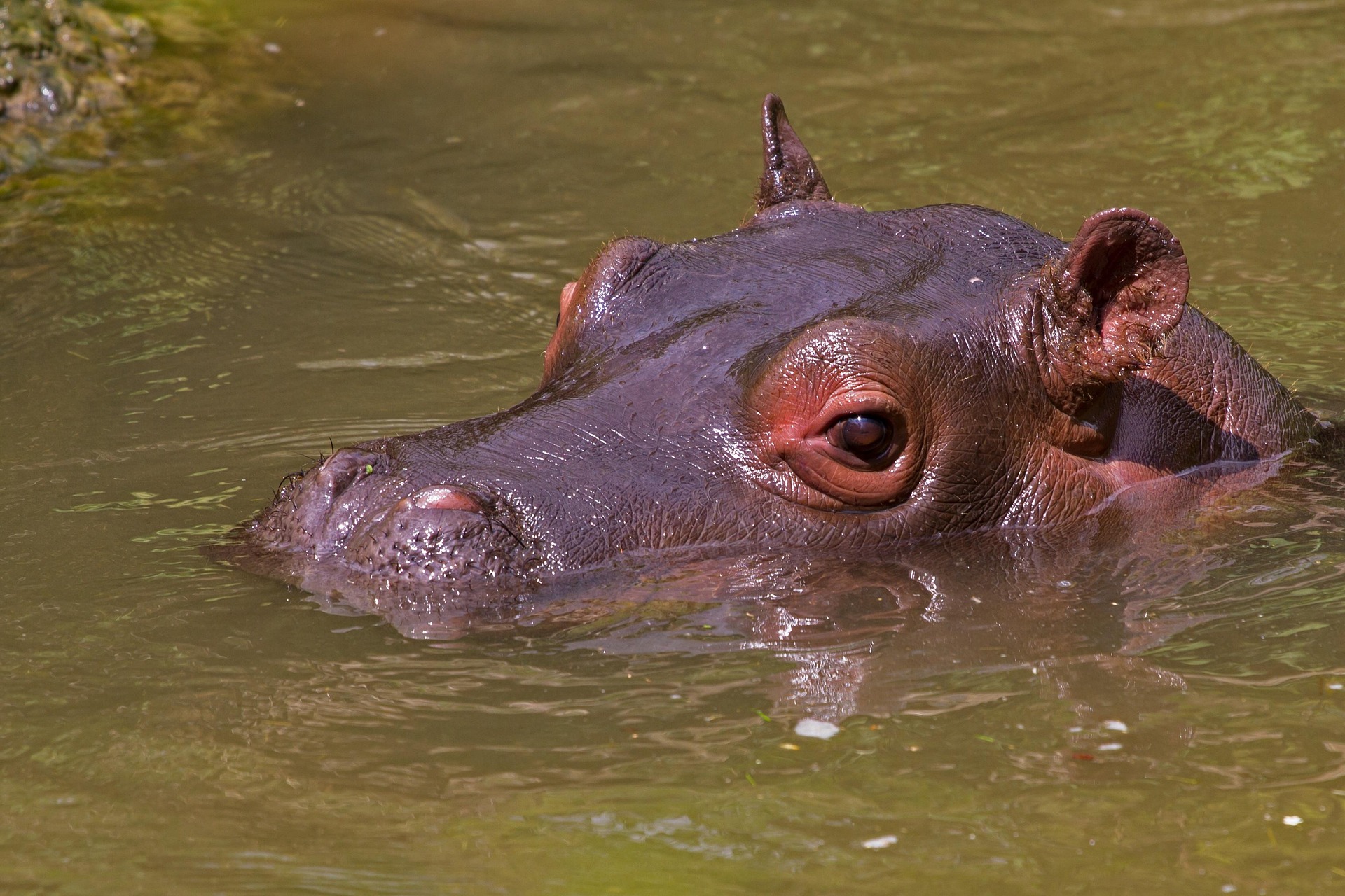 陸上の大型動物ですが、生活の中心は水辺です。皮膚が乾燥や日差しに弱いため、日中は水に浸かって過ごします。泳いでいるように見えますが、実際は水底を歩いて移動することも多い動物です。